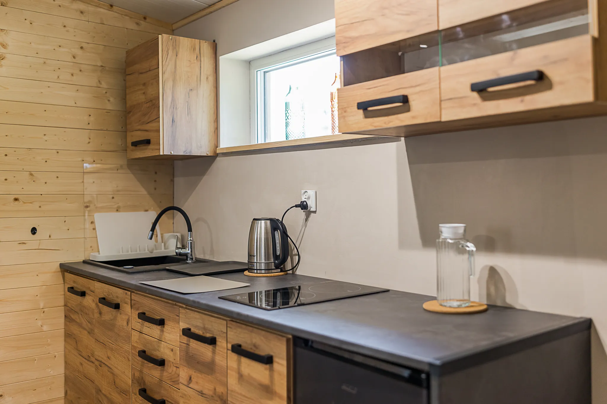Domki położone są tuż przy potoku, wśród zieleni, oferują nie tylko bliskość przyrody, ale także komfortowe wnętrza i przestronne, drewniane tarasy. To idealna przestrzeń, aby zwolnić tempo, nabrać oddechu i cieszyć się chwilą.